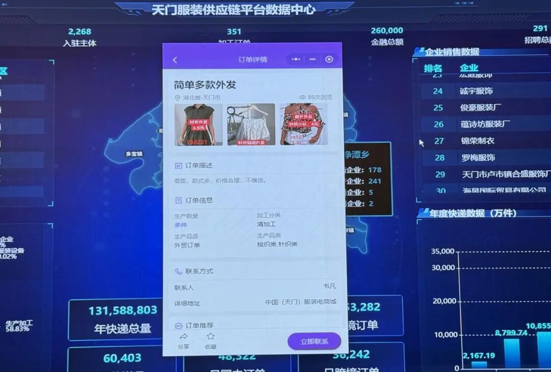 “自4月份运行以来,平台用户数已超2万名、认证经营主体3000家以上,累计完成400余次供需订单对接,撮合交易金额超千万元。”“天门衣尚”供应链信息平台负责人游力介绍,“用户通过电脑或手机,就能完成供应链全流程对接和业务操作,特别方便。”