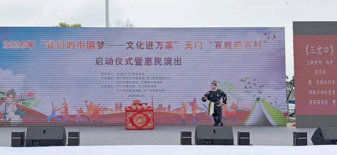 启动仪式后,折子戏《三岔口》、歌曲《多情的土地》、小品《男大当婚》、折子戏《坐楼杀惜》、歌曲《第一天》、天门说唱《传家宝》、舞蹈《走进新时代》等惠民演出节目轮番上演,赢得现场掌声不断。