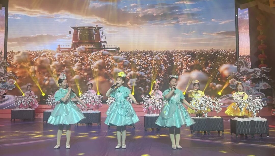 随后,由孩子们带来的《赶秧雀》《摘棉花》《幸福歌》联唱,宛如一股清新的田野之风。孩子们纯真的笑脸、清澈的嗓音,将劳动中的喜悦与对幸福生活的赞美演绎得淋漓尽致,让传统民歌焕发出勃勃生机。