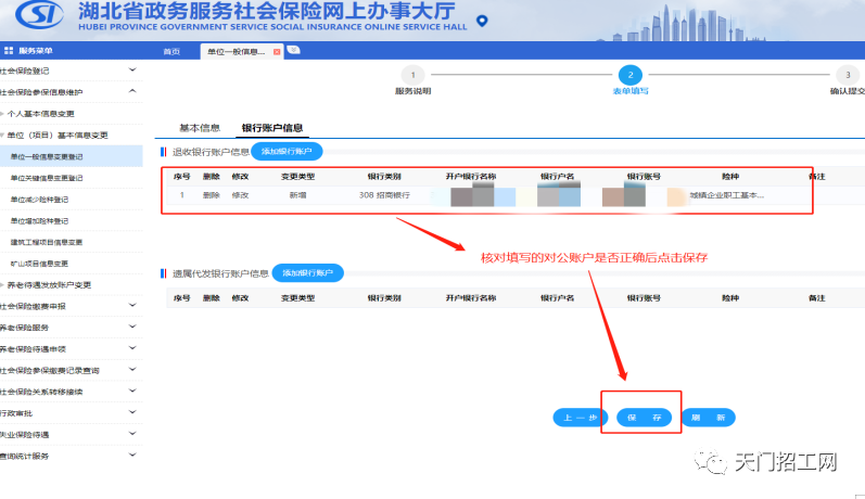 请登录湖北政务服务网,点击“企业职工养老保险信息系统”,进入“湖北省政务服务社会保险网上办事大厅”,点击“单位(项目)基本信息变更”中“单位一般信息变更登记”,进入“银行账户信息”湖北政务服务网:http://zwfw.hubei.gov.cn/