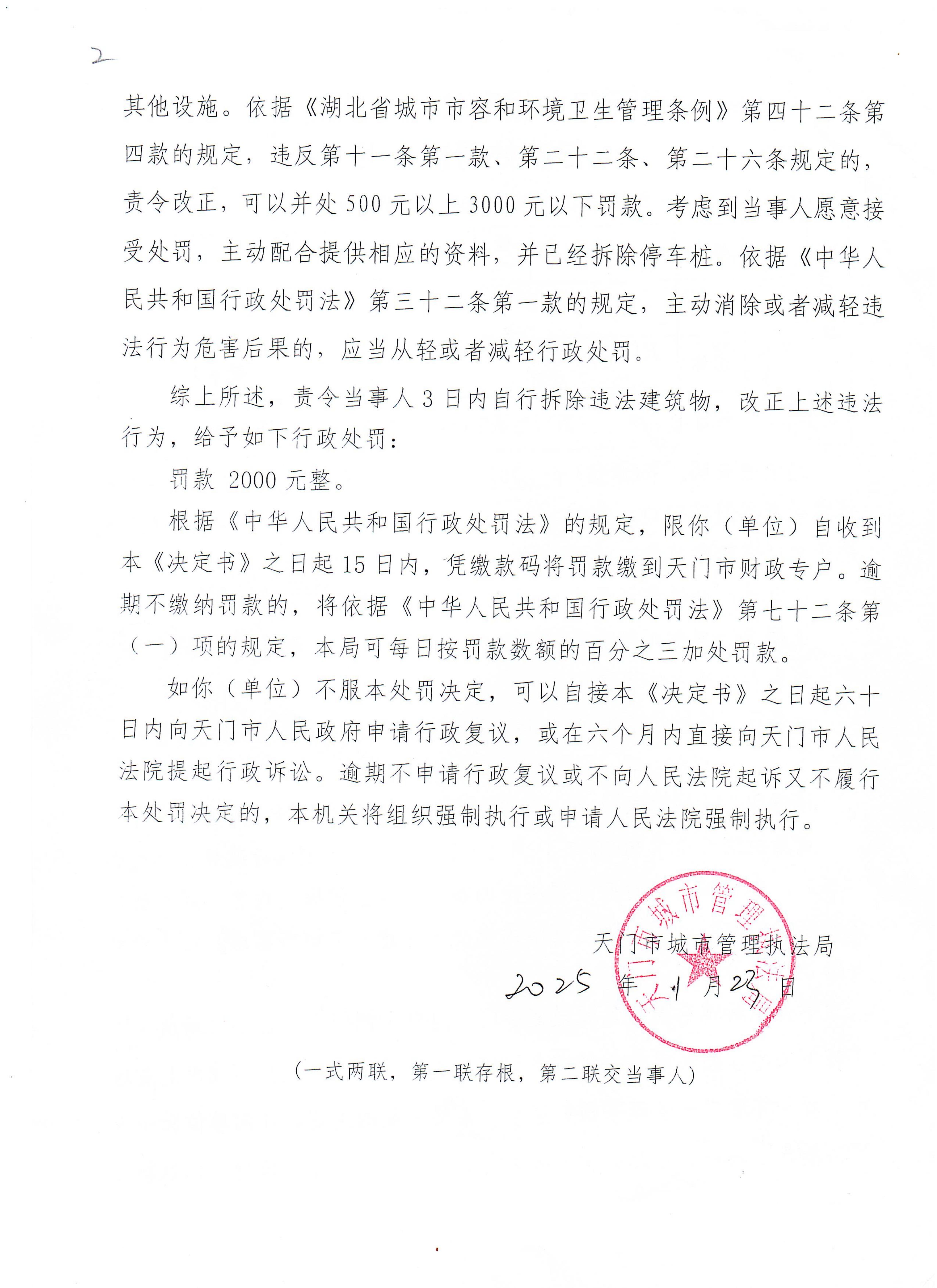 天门市城市管理执法局行政处罚案件2025年001号
