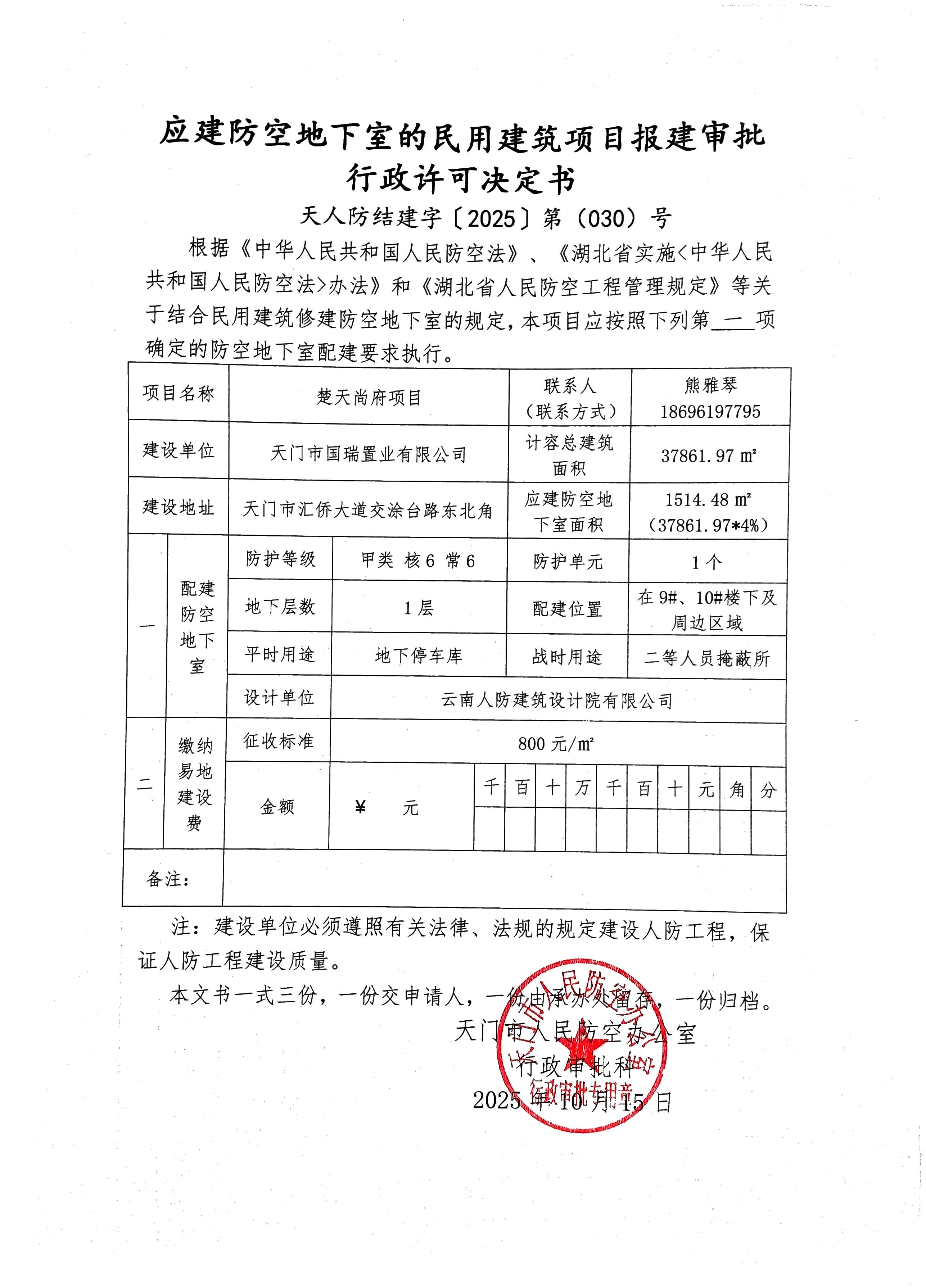 应建防空地下室的民用建筑项目报建审批行政许可决定书