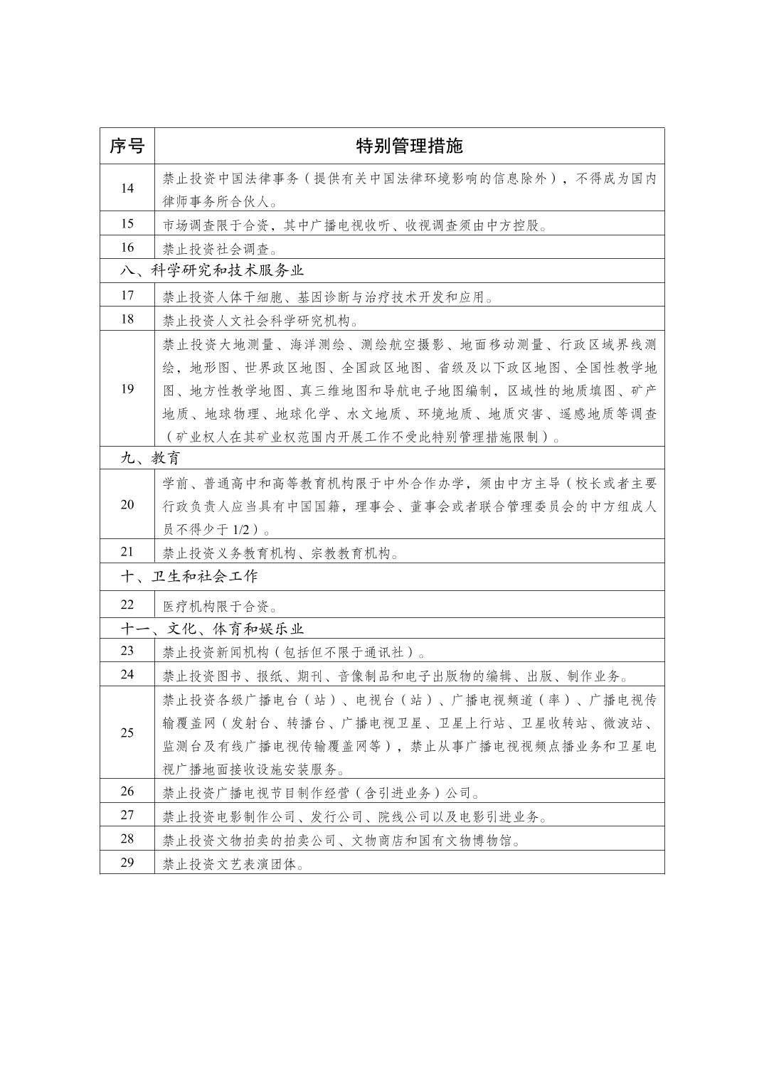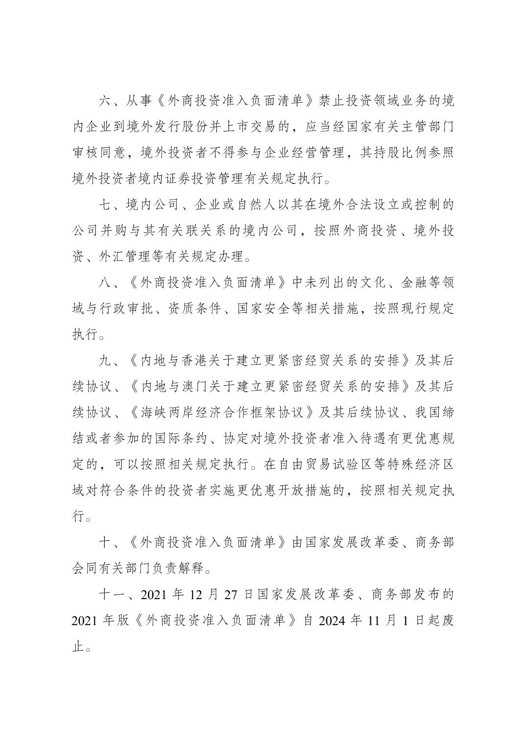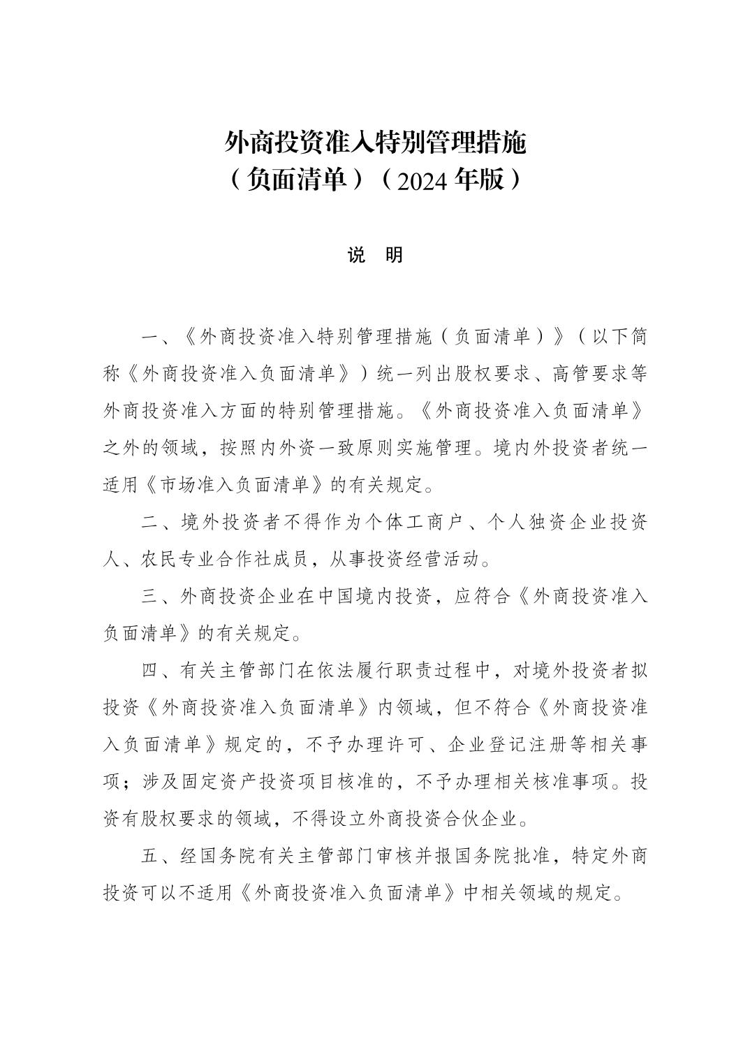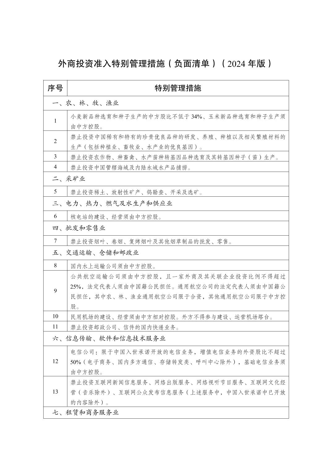 外商投资准入特别管理措施(负面清单)(2024年版)