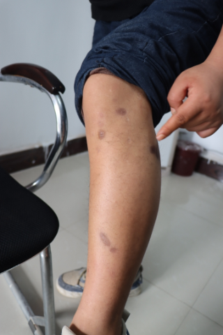 在派出所里,王威撩起袖子、掀起后背,向民警展示身上的累累伤痕。一道道长长的暗黑伤疤,是鞭子抽打的;密密麻麻的白色圆点,是电棍击打的。