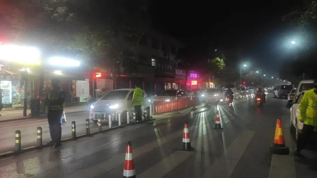 夜幕降临,乡村主干道的卡点警灯依旧闪烁,成为守护年关平安的“平安灯塔”。