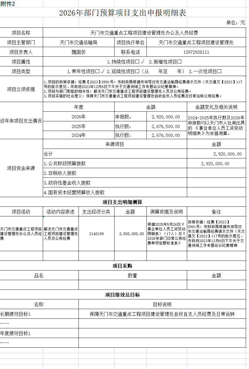 项目理由:为解决天门市交通重点工程项目建设管理处2025年度自收自支人员经费及日常运转公用经费,为促进天门公路建设事业持续发展和行业稳定,保障各项工作的正常开展,依据天门市人民政府收文经费【2023】0991号批示、交通局来文天交通文【2023】117号文《市交通运输局关于解决市交通重点工程项目建设管理处办公及人员经费的请示》,按照交通领域工作专题会议纪要精神,市交通重点工程项目建设管理处自收自支人员经费及日常运转公用经费按照2025年度实际情况为基数测算)292万元实行年度包干预算,并纳入2026年及以后年度预算。