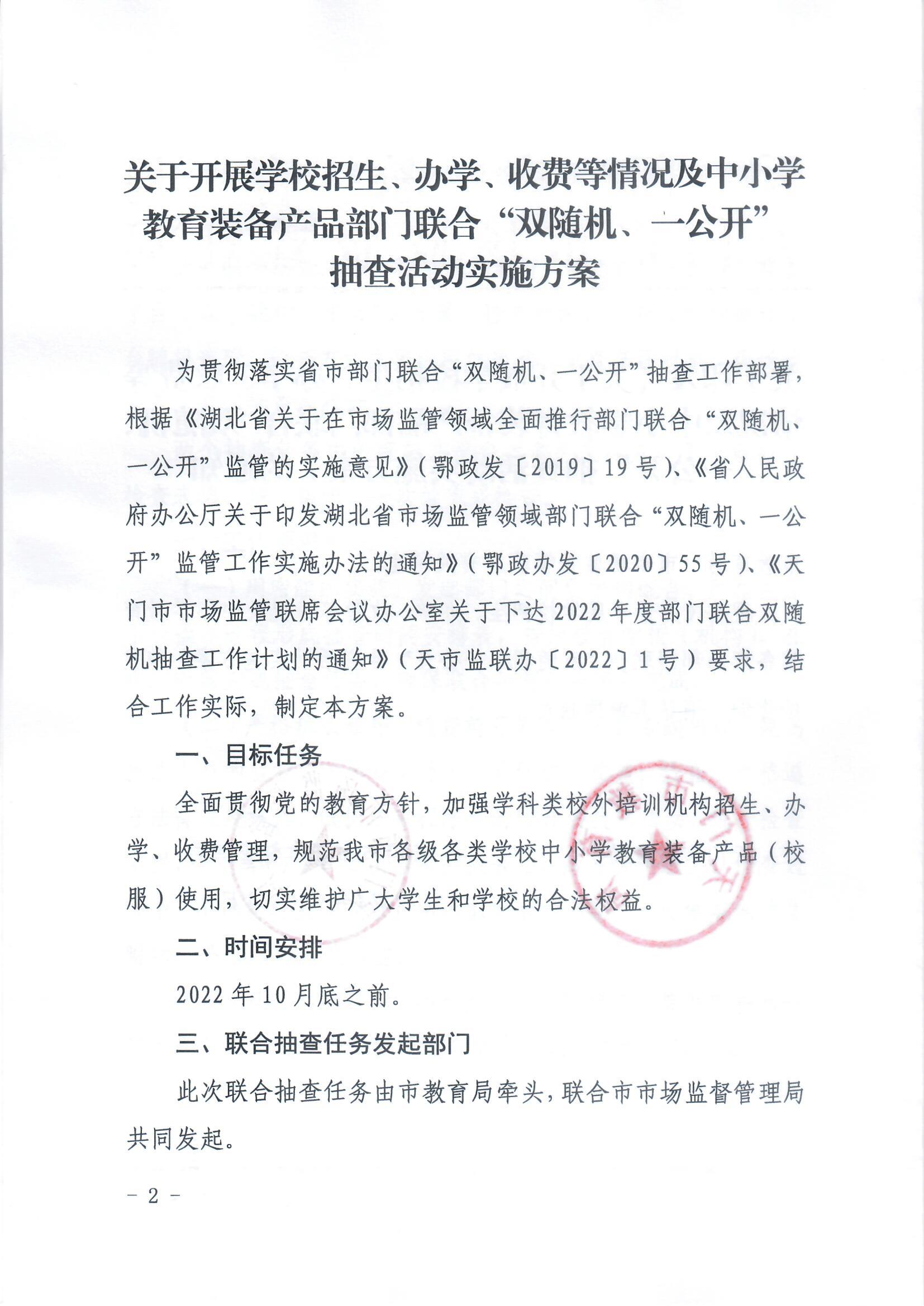 关于开展学校招生、办学、收费等情况及中小学教育装备产品部门联合“双随机、一公开”抽查活动实施方案
