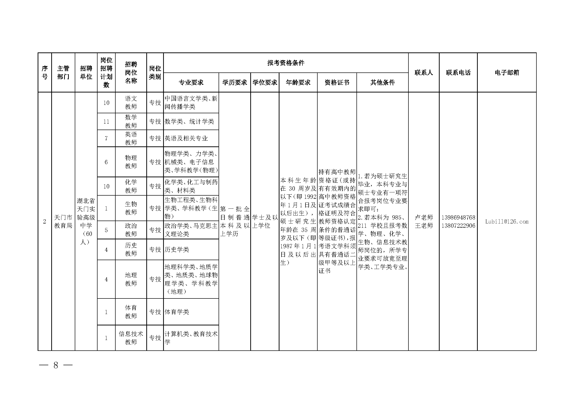 1.本次招聘的具体单位、岗位及资格条件详见《2023年湖北省天门市教育局直属学校招聘岗位明细表及联系方式》(附件1);