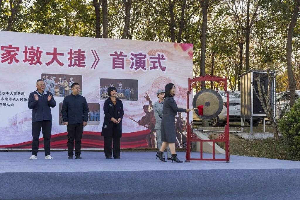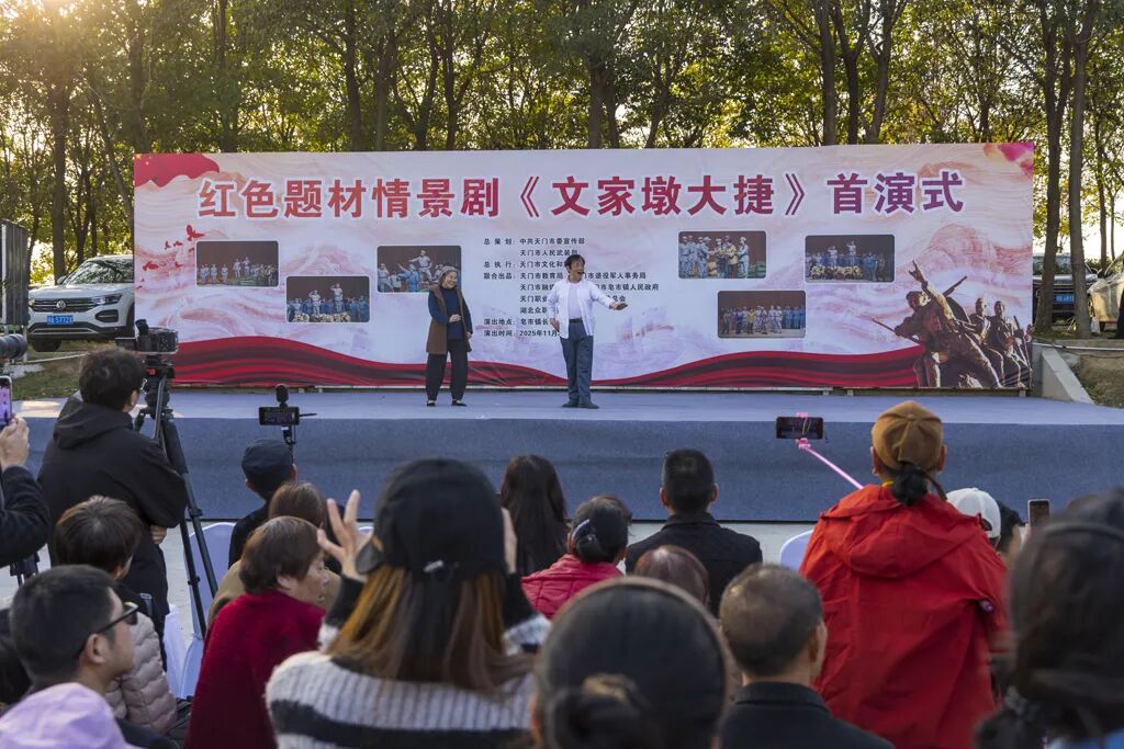 11月20日,由市委宣传部、市人武部总策划,市文旅局总执行,市教育局、市退役军人事务局、市融媒体中心、皂市镇人民政府、天门职业学院、市慈善总会、湖北众联享付科技有限公司联合出品的红色题材情景剧《文家墩大捷》在天门市皂市镇长寿山风景旅游区成功首演。市人民政府副市长古玉丽、湖北众联享付科技有限公司总经理黄浩等领导和嘉宾一同观看演出。