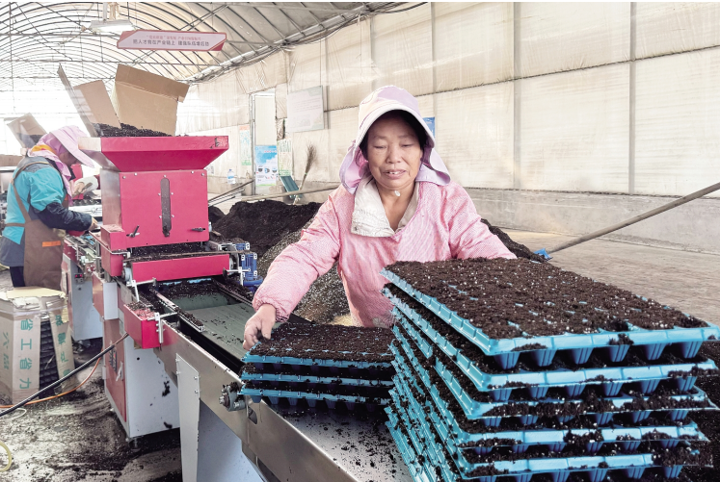 装填基质、点籽种、盖苗盘……近日, 位于多宝镇的湖北铭禾农业科技有限公司育苗棚内一片忙碌,员工正抢抓农时开展蔬菜点籽育苗工作。该公司实施订单育苗、 按需供苗,从去年 7 月份开始陆续培育包菜、花菜、西蓝花、大白菜、辣椒等蔬菜苗,目前正加快种苗培育,助力农业生产。