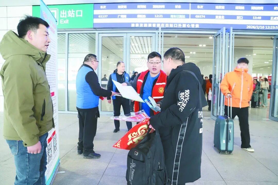 2月10日,在沿江高铁天门站出站口,市社保局、市居保局工作人员为返乡人员送上“福”字、对联等,并讲解有关养老保险政策,实现“社保服务找人”。连日来,市人社部门组织专班人员,开展以“传递社保温情 服务万家百姓”为主题的社保政策服务进万家活动,不断提升我市城乡居民的满意度和获得感。
