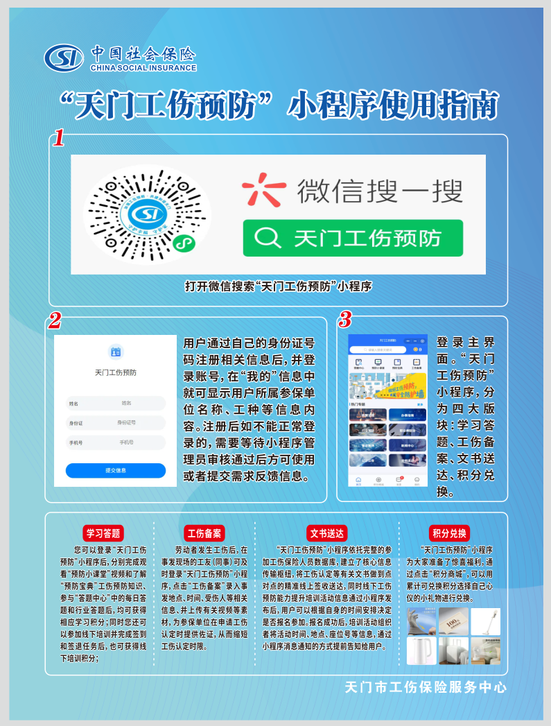 为深入贯彻“人民至上、生命至上”理念,推动工伤预防工作深入开展,切实增强全市用人单位和劳动者的工伤预防意识与自救互救能力,我市正式推出“天门工伤预防”微信小程序,旨在为全市用人单位及劳动者提供便捷、高效的学习与服务平台。