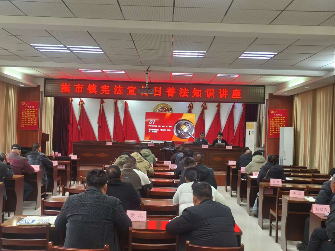 同日,拖市司法所邀请武汉多能律师事务所两名专业律师,在镇会议室以“学习宣传贯彻习近平法治思想,推动宪法深入人心”为专题做了一堂宪法知识讲座。拖市镇政法办负责人表示,将继续以“宪法宣传周”为契机,不断创新普法形式,推动宪法宣传常态化、制度化,让宪法精神深入人心,让法治成为社会共识和基本准则,为拖市镇高质量发展提供有力法治保障。