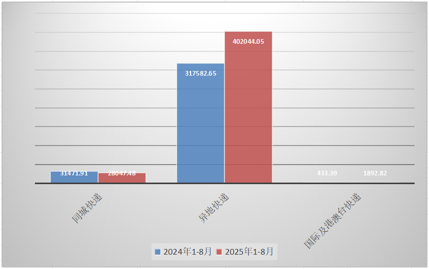 1-8月,同城快递业务量累计完成2.80亿件,同比下降10.88%;异地快递业务量累计完成40.20亿件,同比增长26.60%;国际/港澳台快递业务量累计完成1892.82万件,同比增长336.75%。