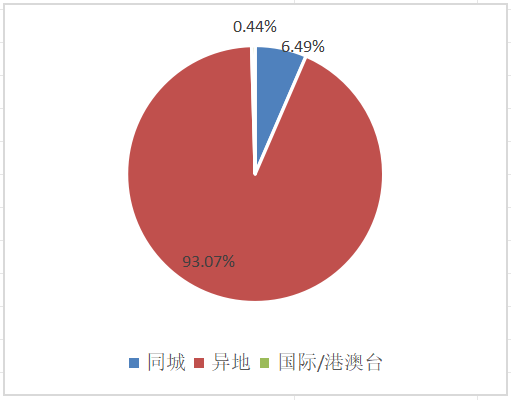 1-8月,同城、异地、国际/港澳台快递业务量分别占全部快递业务量的6.49%、93.07%和0.44%。与去年同期相比,同城快递业务量的比重下降2.52个百分点,异地快递业务量的比重上升2.20个百分点,国际/港澳台快递业务量的比重上升0.32个个百分点。