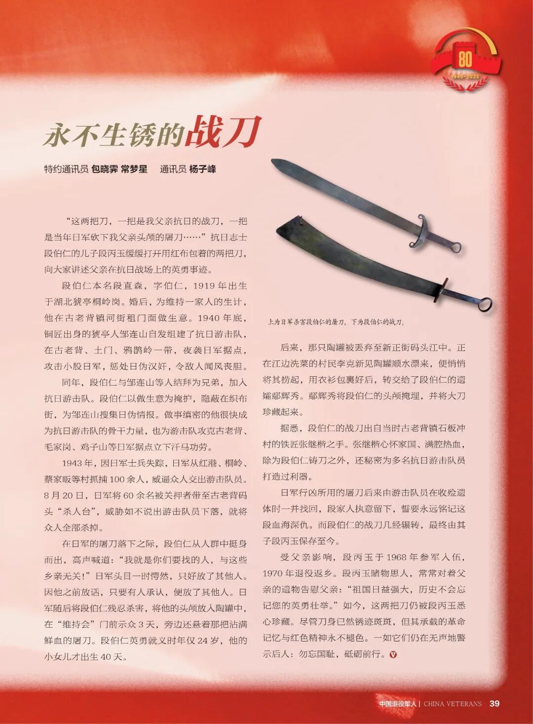 《中国退役军人》杂志10月刊“红色传家宝”栏目刊发《永不生锈的战刀》报道。“这两把刀,一把是我父亲抗日的战刀,一把是当年日军砍下我父亲头颅的屠刀……”抗日志士段伯仁的儿子段丙玉缓缓打开用红布包着的两把刀,向大家讲述父亲在抗日战场上的英勇事迹。