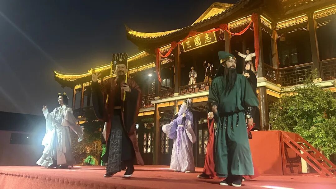 从白天到夜晚,景区沉浸式互动贯穿全程。汉关风云、张飞献唱、貂蝉招亲、三国快闪秀等节目轮番上演,精彩连连。19时30分,景区广场灯火骤暗,大型历史舞台剧《梦里三国铁花秀》拉开帷幕,现场烈焰腾空,铁水飞溅,万点金花如流星雨倾泻而下,映红了观众的脸庞。邵女士一家八口专程从荆州赶来,她举着手机久久不愿放下:“以前只在短视频里看过打铁花,今天第一次看现场,漫天星光在头顶绽放,真的太震撼了!”