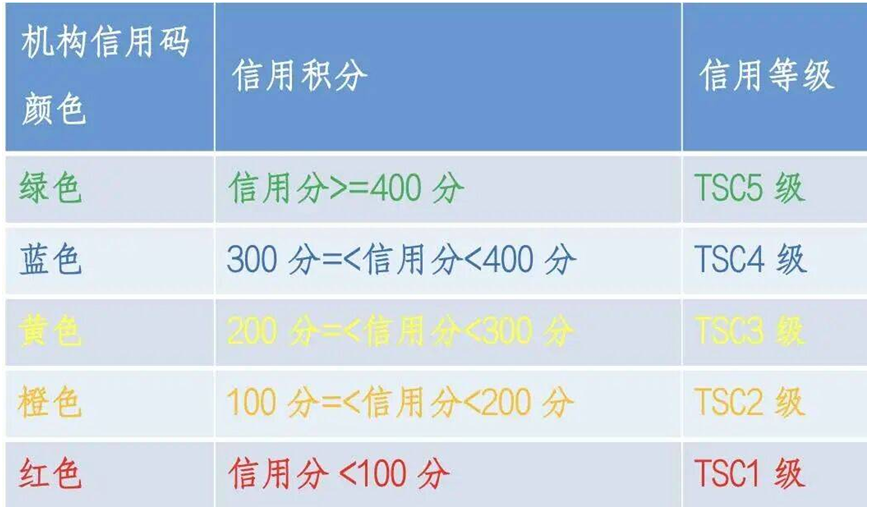 “机构信用码的五种颜色代表不同的信用级别,从高到低分别为绿色TSC5级;蓝色TSC4级;黄色TSC3级;橙色TSC2级;红色TSC1级。