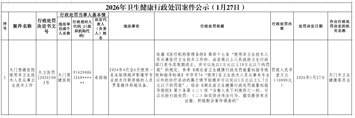 2026年卫生健康行政处罚案件公示(1月27日)