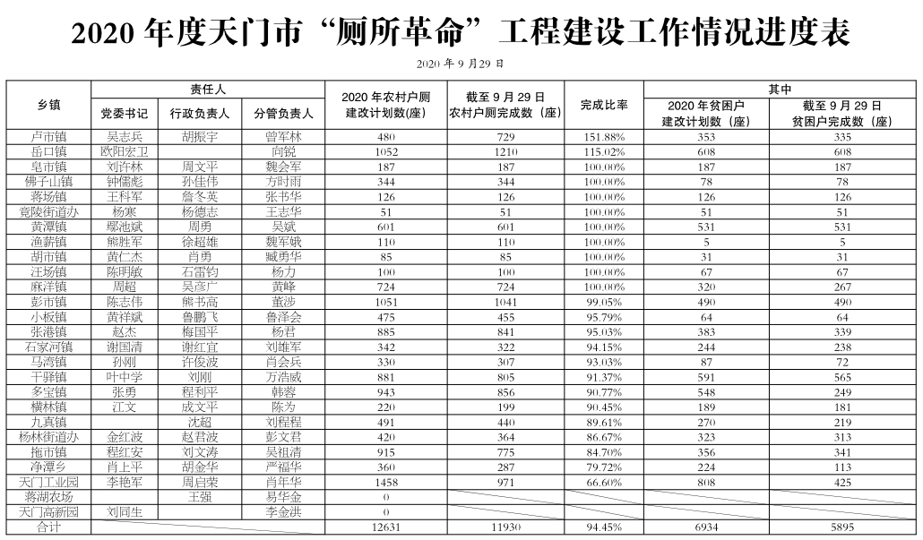 2020年度天门市“厕所革命”工程建设工作情况进度表