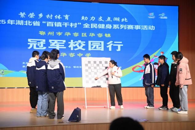 赛场之外,系列活动还进一步拓展了“体育+”的融合维度。“冠军校园行”特邀国际跳棋女子国际特级大师赵汗青先后走进天门市万林实验小学、高新园小学和第一初级中学,与近千名学子面对面交流,分享竞技故事与体育精神。在高新园小学活动现场,五年级的罗奕阳同学激动地表示:“今天见到国际跳棋冠军真的太激动啦,手心都有点小冒汗呢!冠军讲的翻盘对局故事超精彩,尤其是那种沉着思考、步步为营的感觉,我听得连眼睛都离不开舞台!以后我也要学习国际跳棋,争取像冠军一样厉害,说不定还能和小伙伴们一起参加比赛呢!”