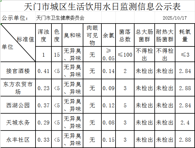 天门市城区生活饮用水日监测信息公示表(2025.10.17)