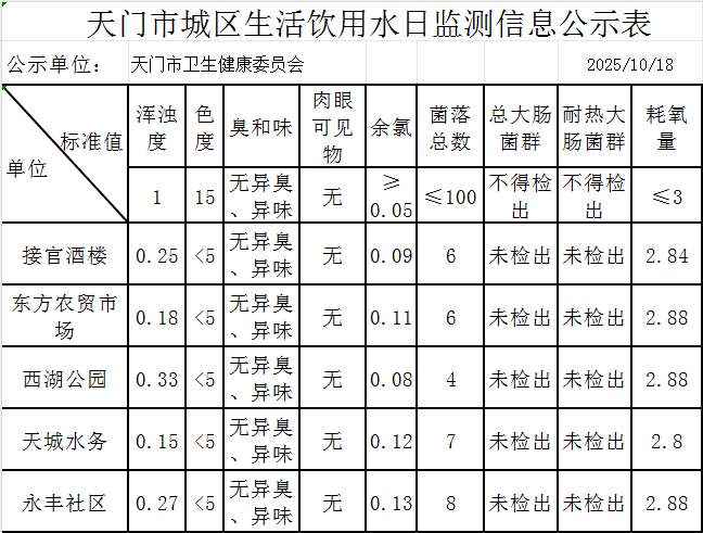 天门市城区生活饮用水日监测信息公示表(2025.10.18)