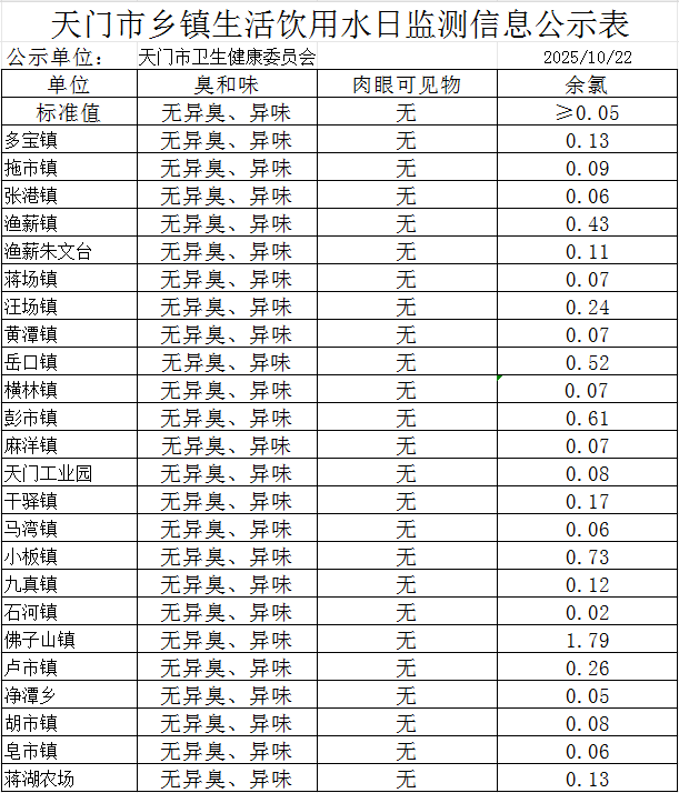 天门市乡镇生活饮用水日监测信息公示表(2025.10.22)