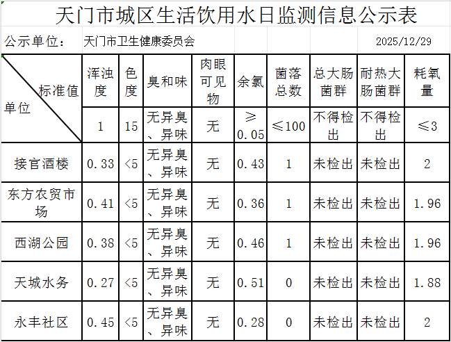天门市城区生活饮用水日监测信息公示表(2025.12.29)