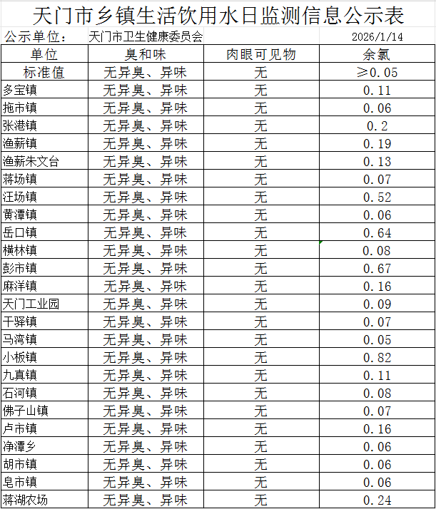 天门市乡镇生活饮用水日监测信息公示表(2026.1.14)