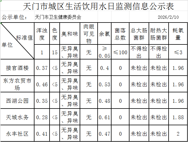 天门市城区生活饮用水日监测信息公示表(2026.2.10)
