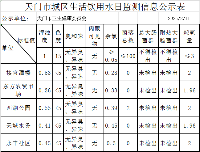 天门市城区生活饮用水日监测信息公示表(2026.2.11)