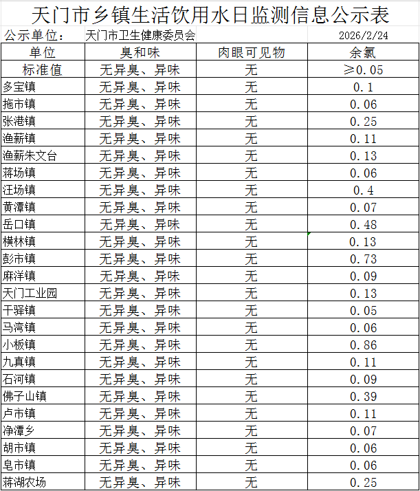 天门市乡镇生活饮用水日监测信息公示表(2026.2.24)