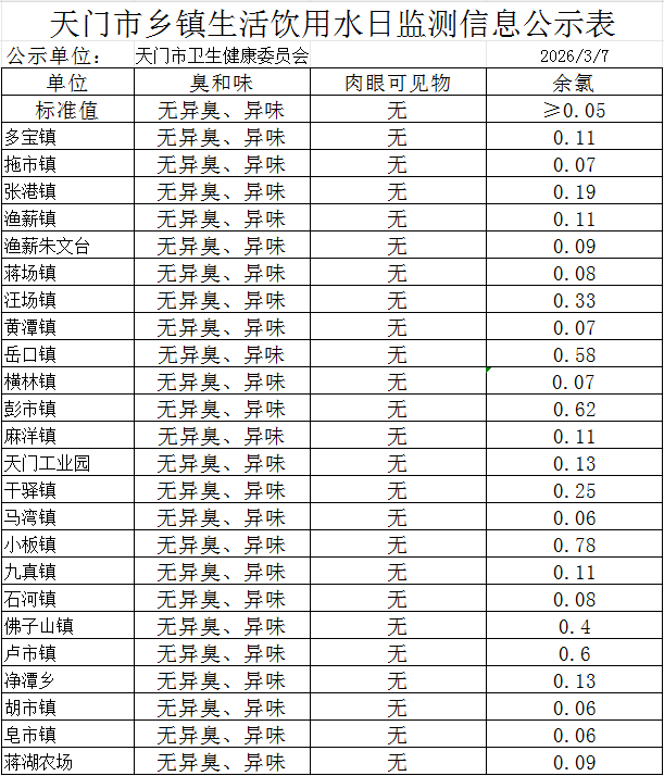 天门市乡镇生活饮用水日监测信息公示表(2026.3.7)