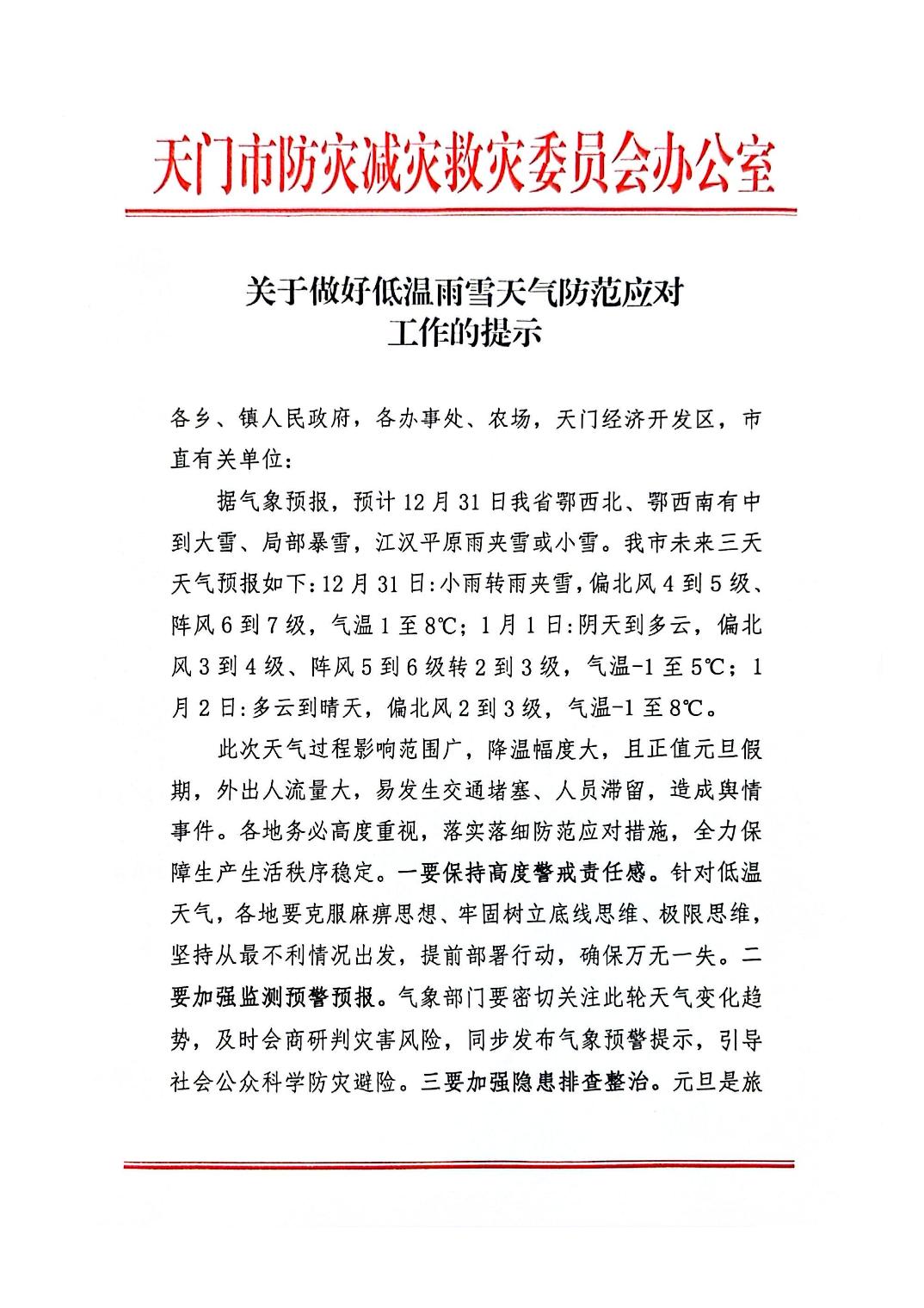 关于做好低温雨雪天气防范应对工作的提示