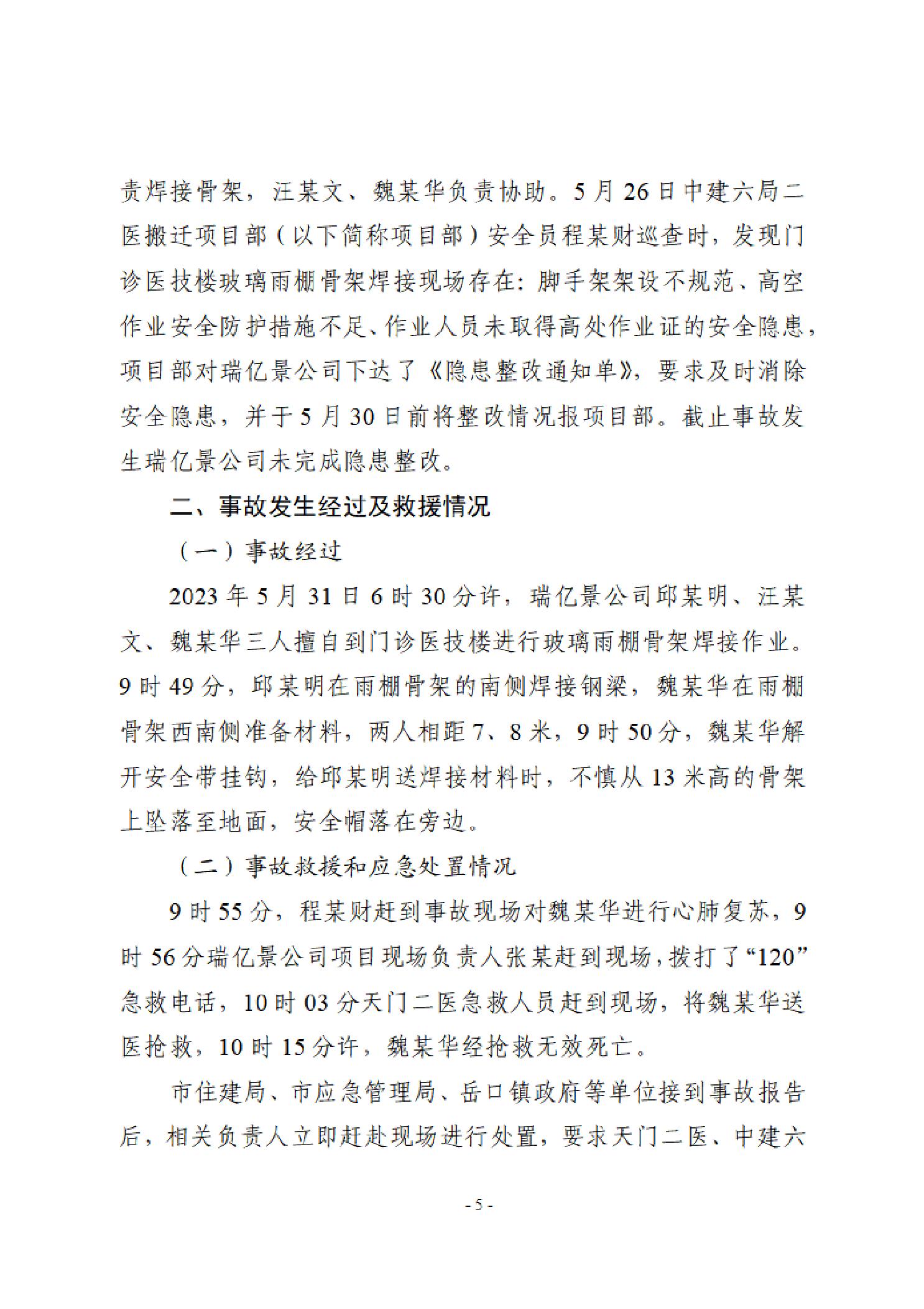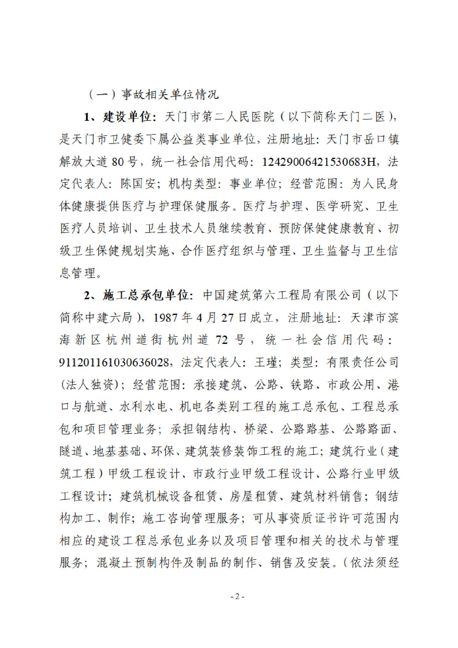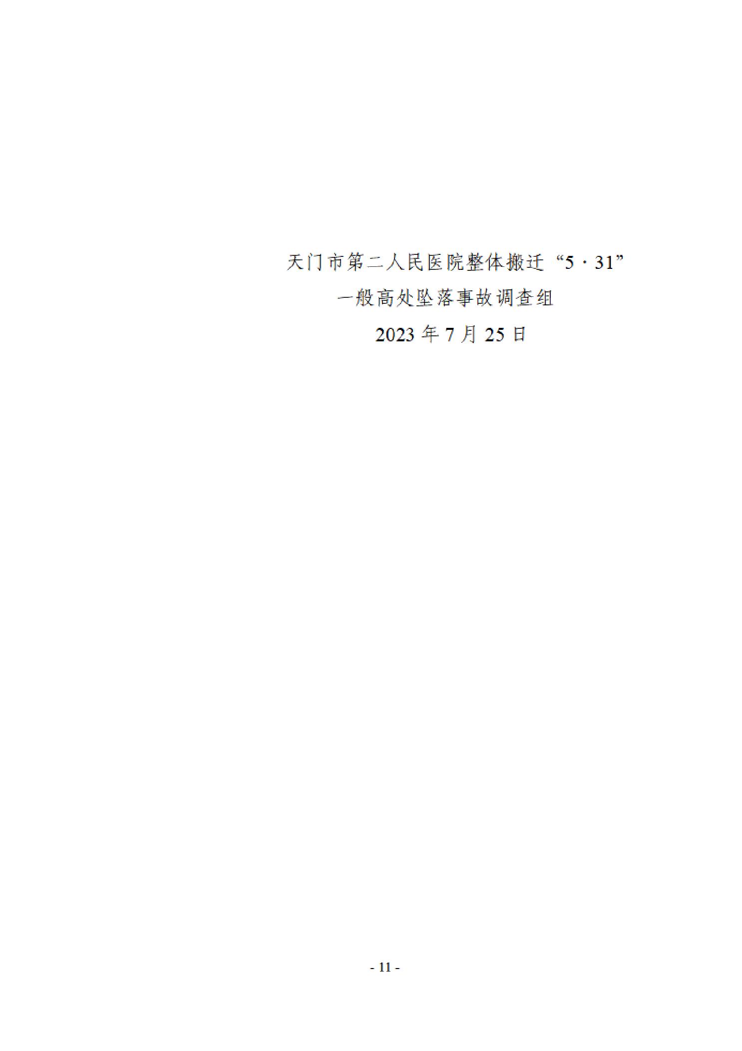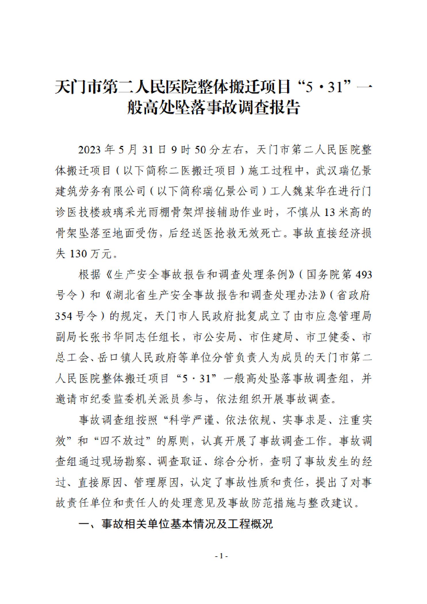 天门市第二人民医院整体搬迁项目“5·31”一般高处坠落事故调查报告