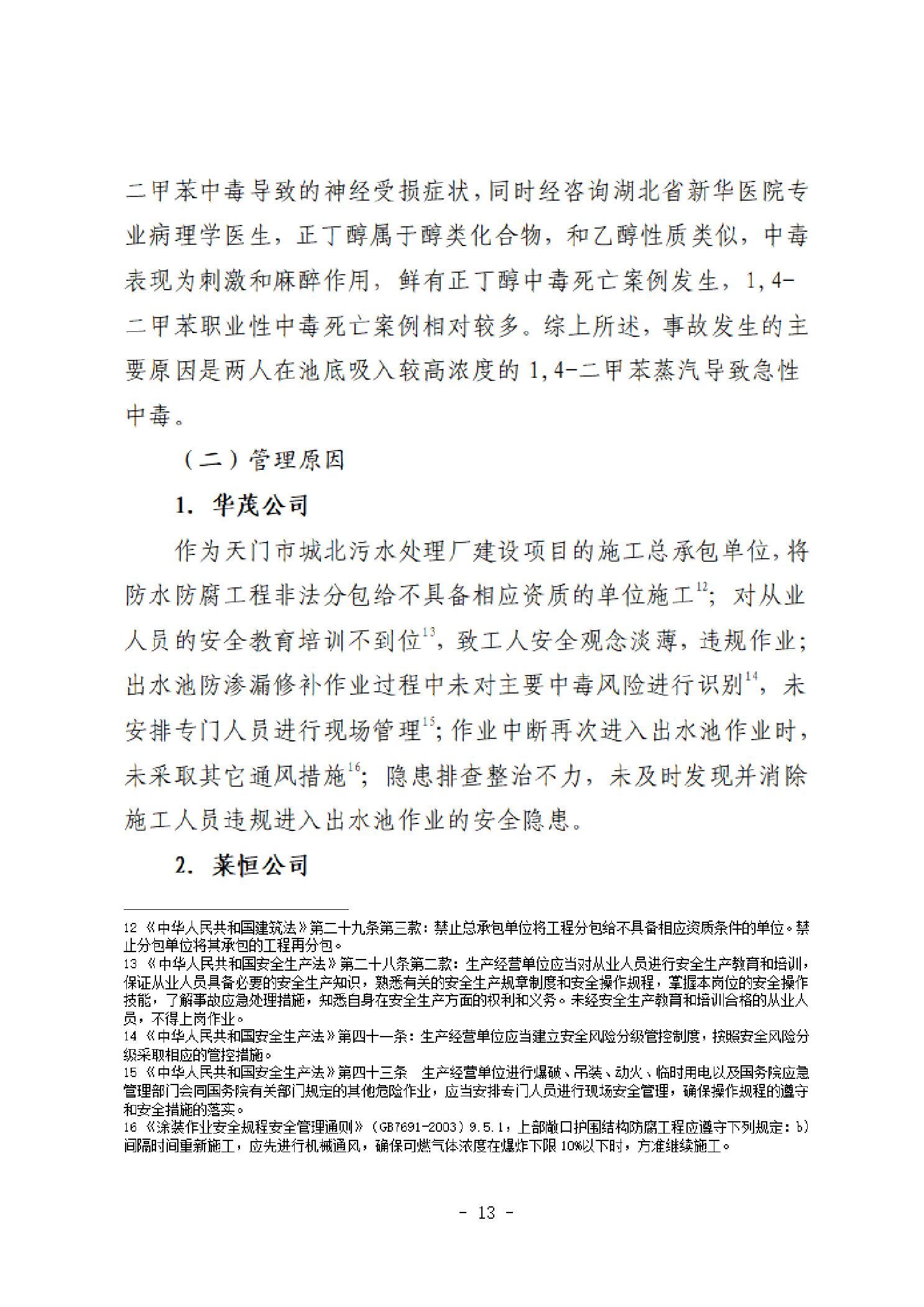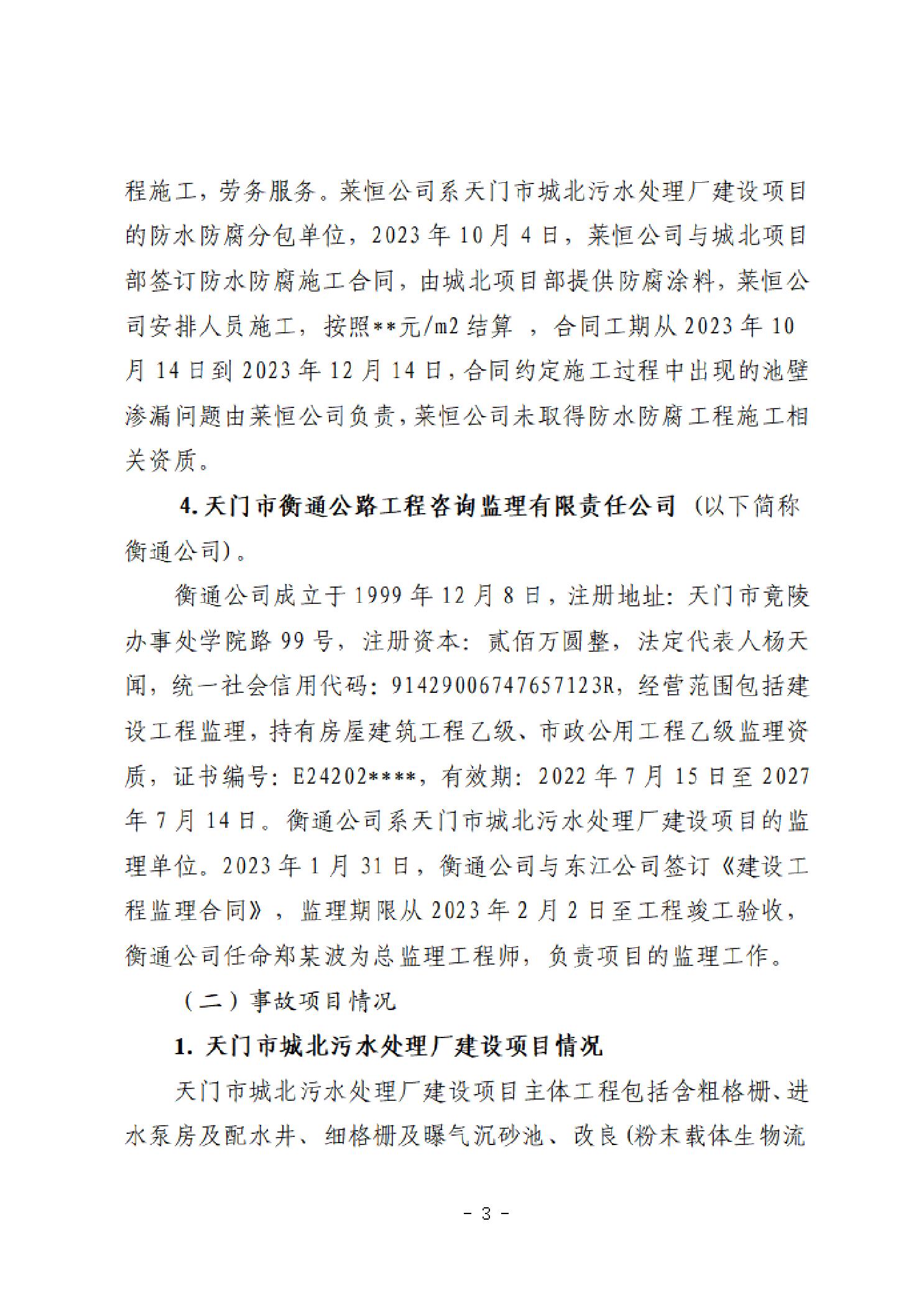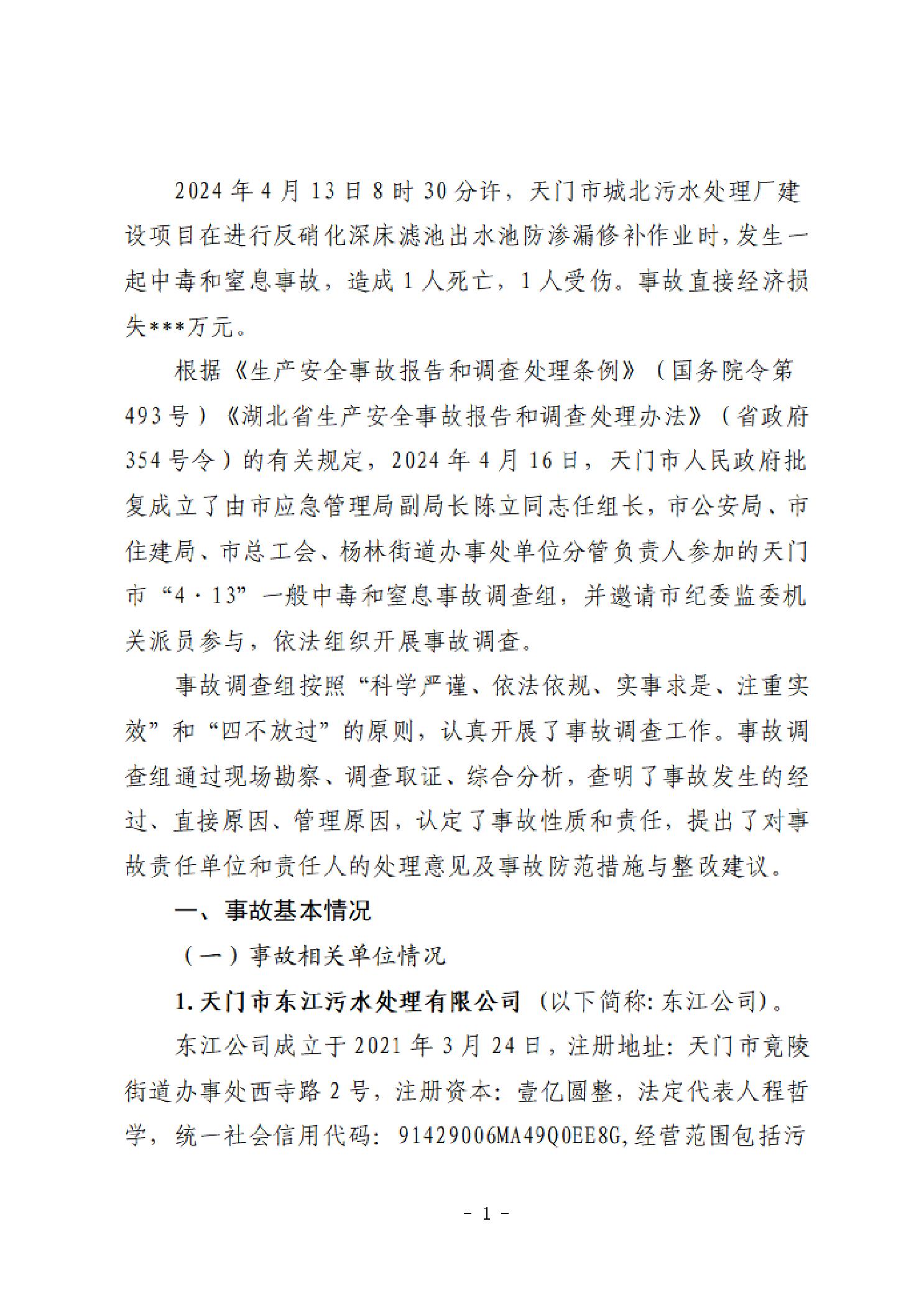 天门市城北污水处理厂建设项目“4·13”一般中毒和窒息事故调查报告