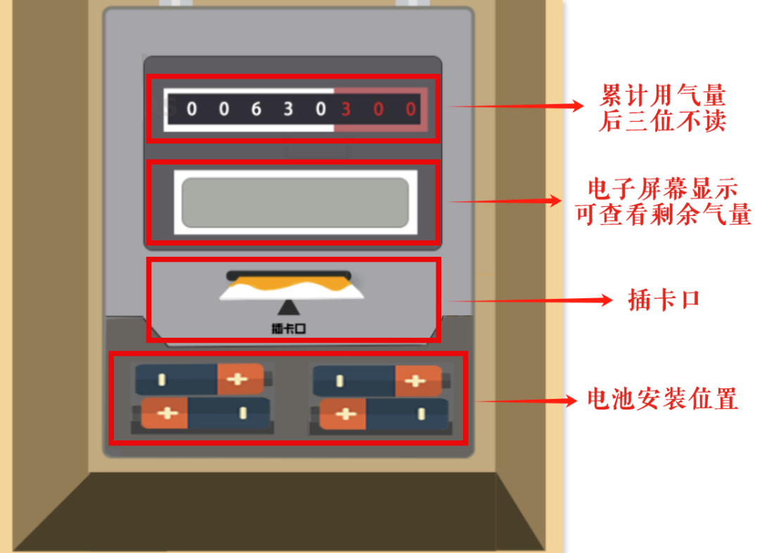 充气上卡:IC燃气卡充值后将有芯片的一端向上插入卡槽,当听到蜂鸣器提示“嘀”声,表示读卡完毕。