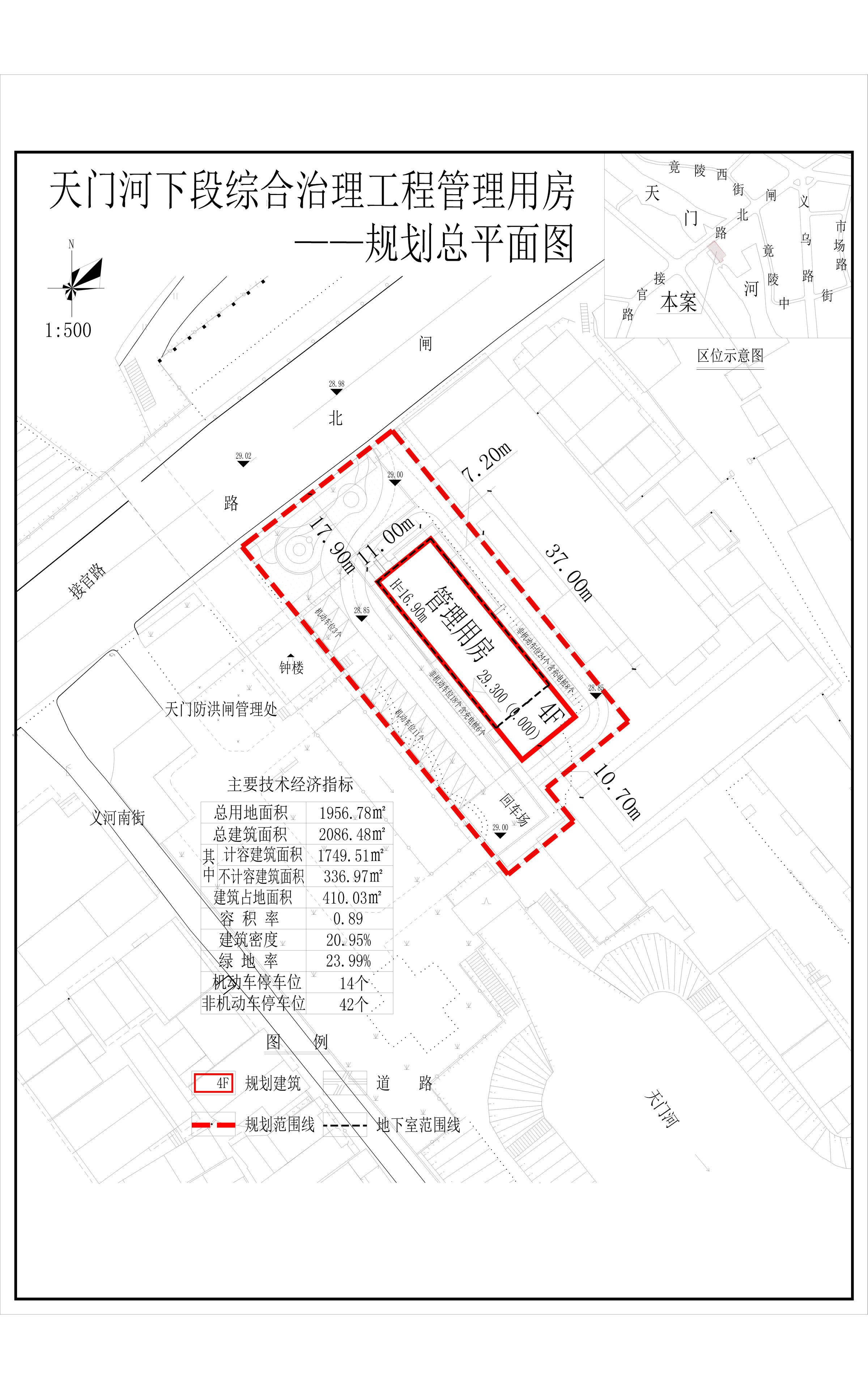 天门市水利和湖泊局申报的天门河下段综合治理工程管理用房项目,位于闸北路以南。本次规划方案主要建设:1栋4层管理用房,以及相关配套设施,具体详见规划总平面图、效果图。经我局审查,拟同意批准该项目规划方案,现将拟批准的规划总平面图予以公示。有关单位或个人如对此规划有异议,请在公示期间向市自然资源和城乡建设局提出书面异议书。