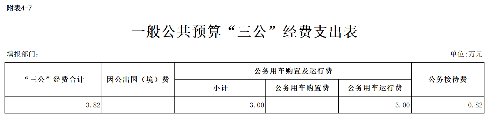 2026年“三公”经费预算3.82万元,较上年预算增加0.24万元,增长6.70%,其中:公务接待费0.82万元,较上年增加0.24万元,增长4.14%,原因为本年预算人员比上年度增加;因公出国(境)费 0万元,与上年持平;公务用车运行费3万元,与上年持平。