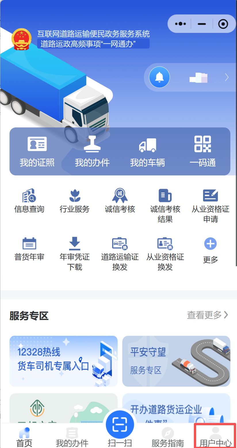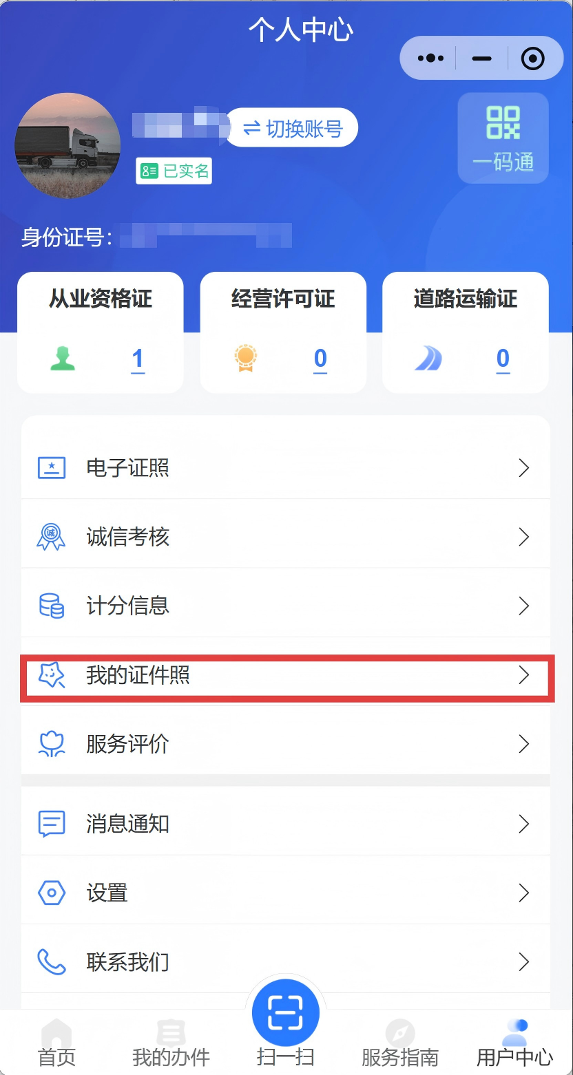 以自然人账号登录"道路运政一网通办"微信小程序后,点击【首页】→【用户中心】→【我的证件照】,可根据上传照片自动裁剪成二寸的标准证件照,用于业务办理。