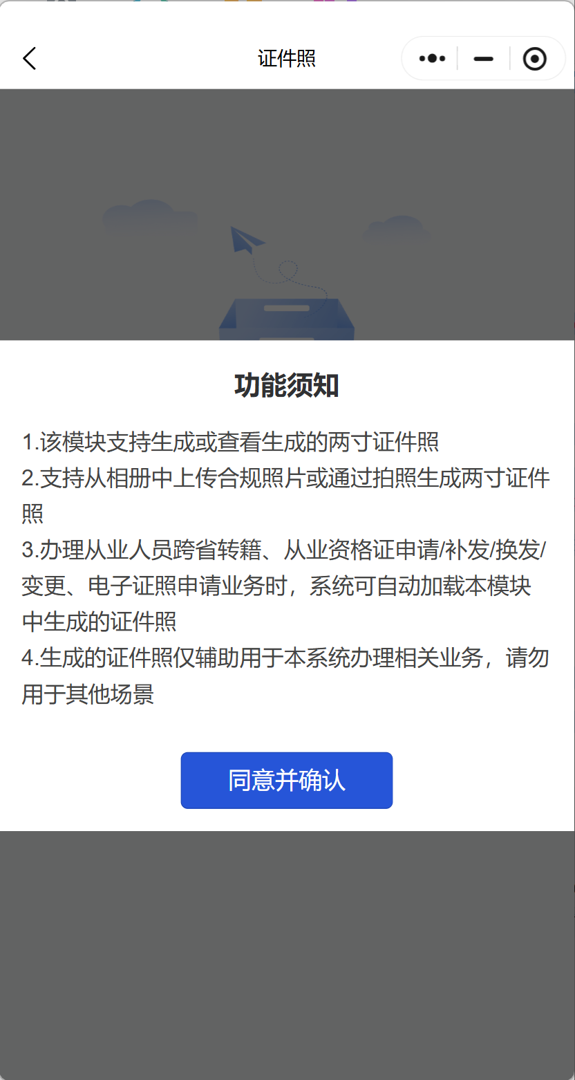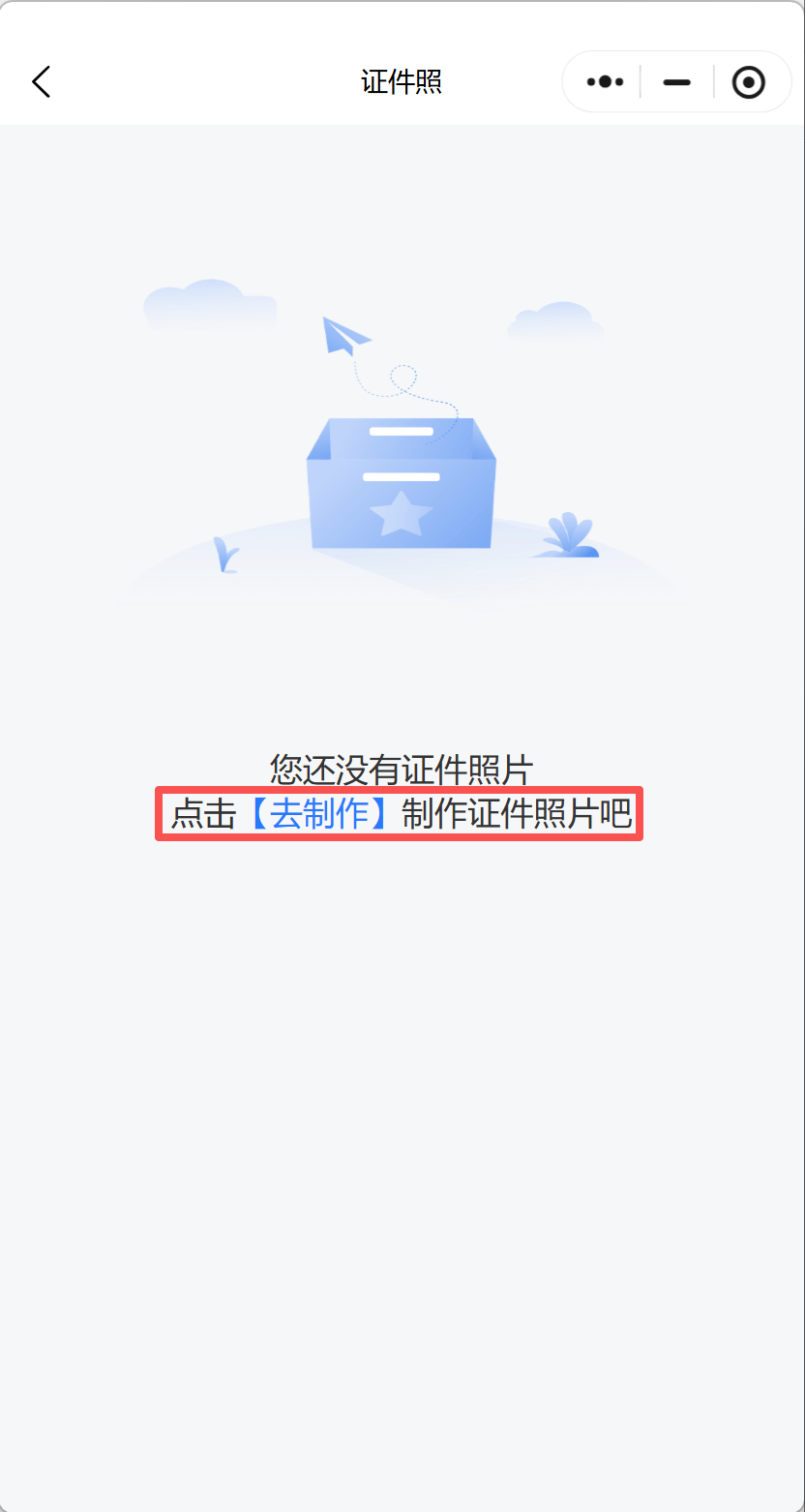 用户在小程序上完成注册登录和实名认证后,如未生成过证件照,点击【用户中心】→【我的证件照】,在查看功能须知后,点击【同意并确认】,系统会提示没有证件照片,点击【去制作】,进入证件照制作流程。