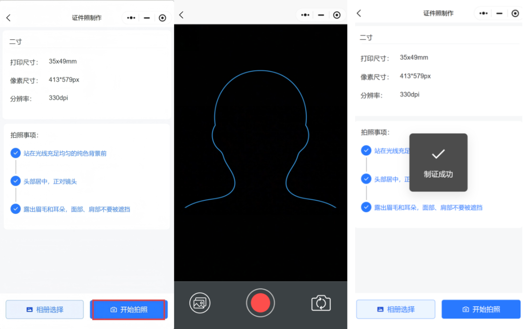 在证件照制作页面,可点击【相册选择】,从手机相册中上传一张照片制作;也可点击【开始拍照】,进入拍摄界面实时拍摄照片上传,拍摄时可参考拍摄界面中的人像线辅助拍摄,系统提示【制证成功】后,标准证件照生成。