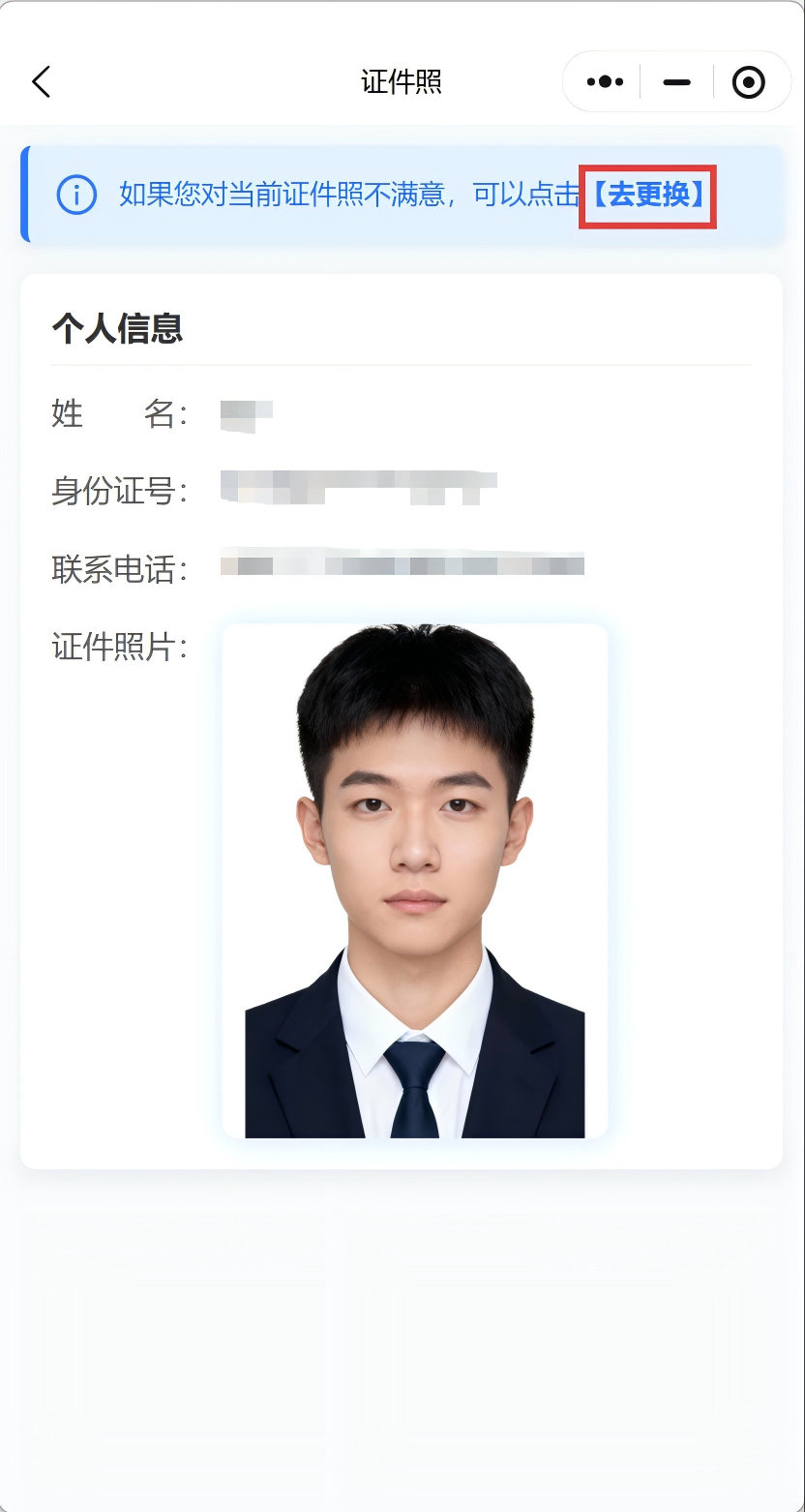 用户可通过【用户中心】→【我的证件照】查看生成的证件照,若对已生成的证件照不满意,可点击右上方的【去更换】重新制作证件照。用户在办理从业人员跨省转籍、从业资格证申请、从业资格证补发、从业资格证换发、从业资格证变更、电子证照申请业务时,在上传申请材料环节,系统将自动上传您制作的证件照作为近期二寸正面免冠彩色证件照。