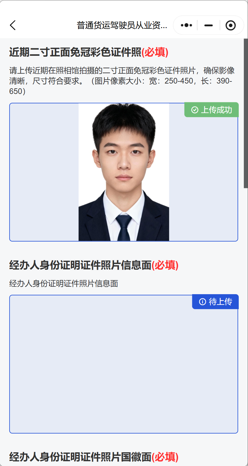本功能支持办理从业资格证申请、从业资格证补发、从业资格证换发、从业资格证变更、跨省转籍、电子证照申请业务的道路运输从业人员生成并上传合规标准两寸证件照。