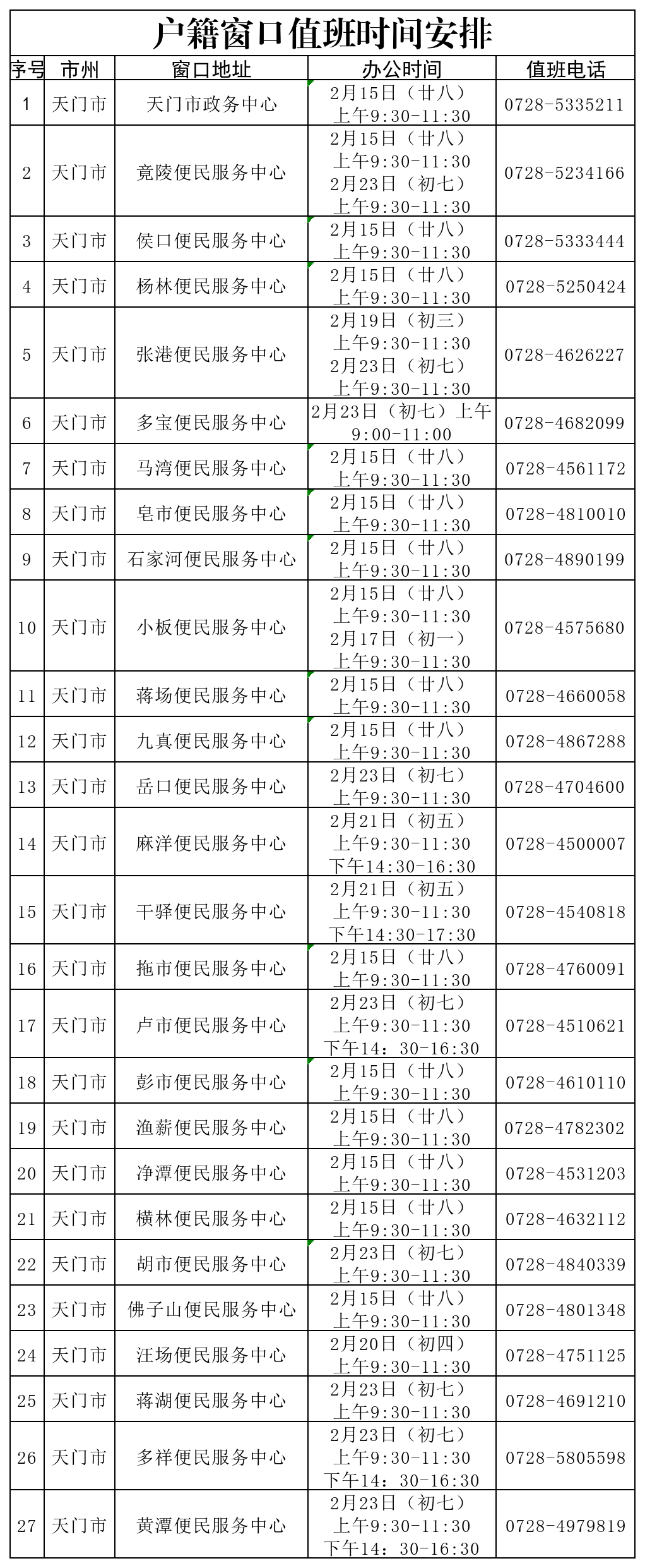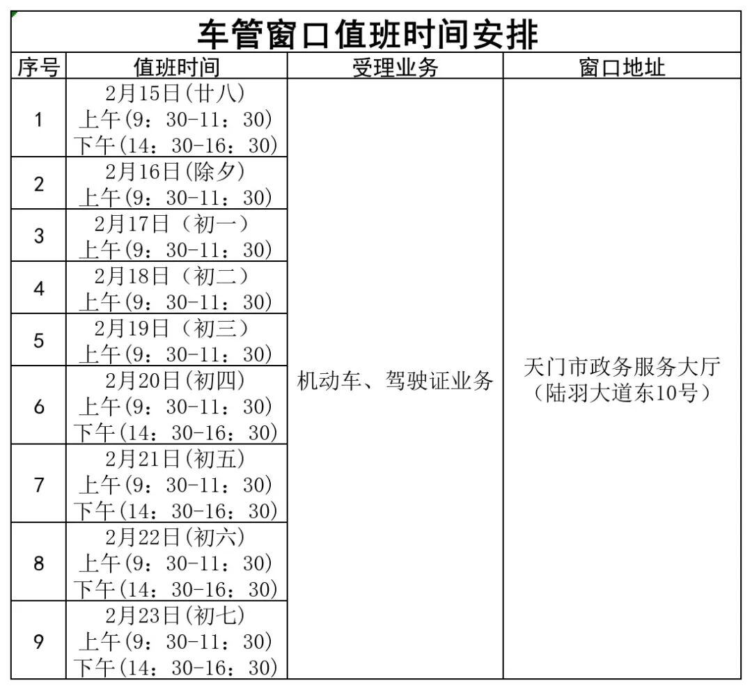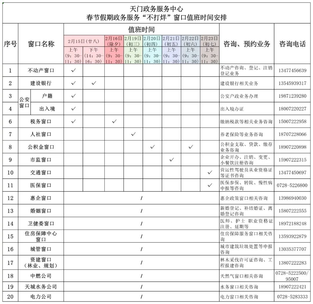 为满足企业主体和群众的办事需求,天门市政务服务中心春节期间将开展线上、线下/电话预约等全方位服务,具体工作安排如下: