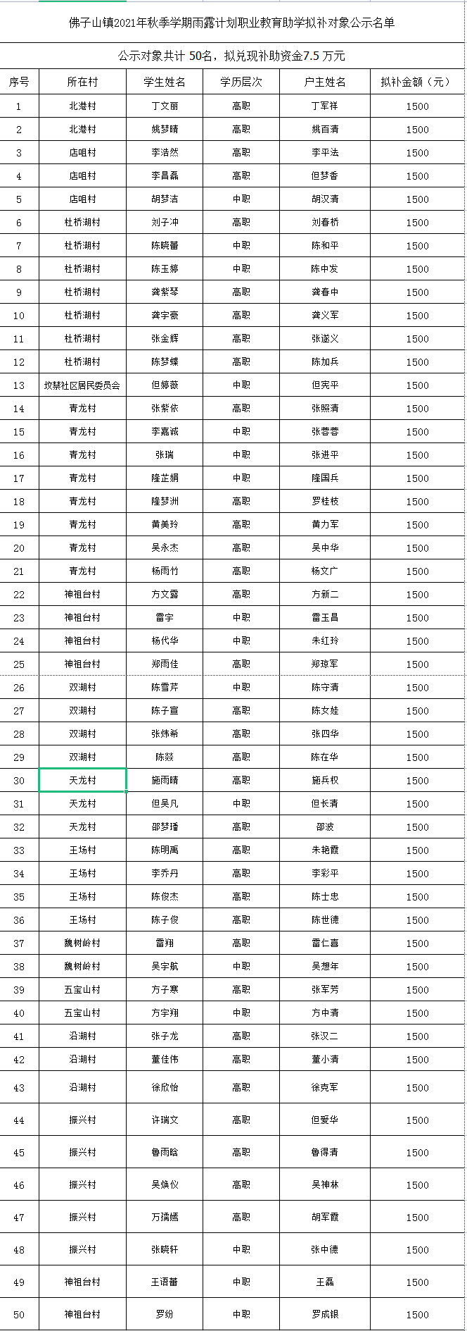 根据《关于切实加强就业帮扶巩固拓展脱贫攻坚成果助力乡村振兴的指导意见》(人社部发〔2021〕26号)关于“继续实施雨露计划,按规定给予相应补助”的要求,经我镇(村委会、社区)入户核查,初审汇总,现将2021年秋季学期雨露计划扶持拟补对象名单(50人、补助资金7.5万元),按户籍地同步在村委会、乡镇政府信息公开平台予以公示。