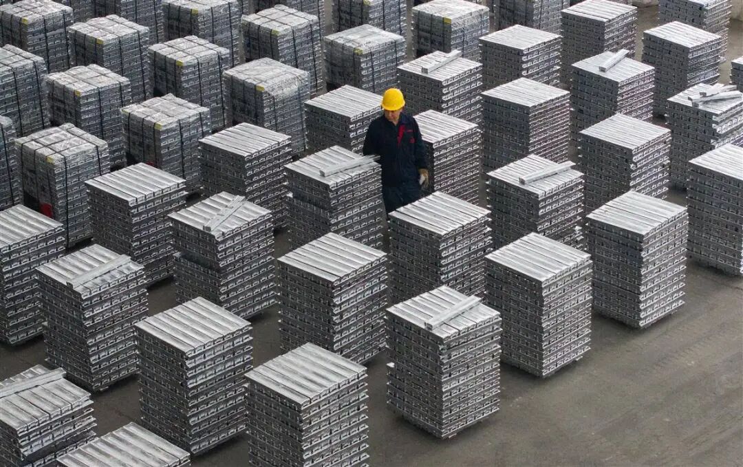 湖北立铭新材料有限公司刚出炉的铝锭被码放成垛,待冷却后装车运走。(湖北日报全媒记者 柯皓 摄)