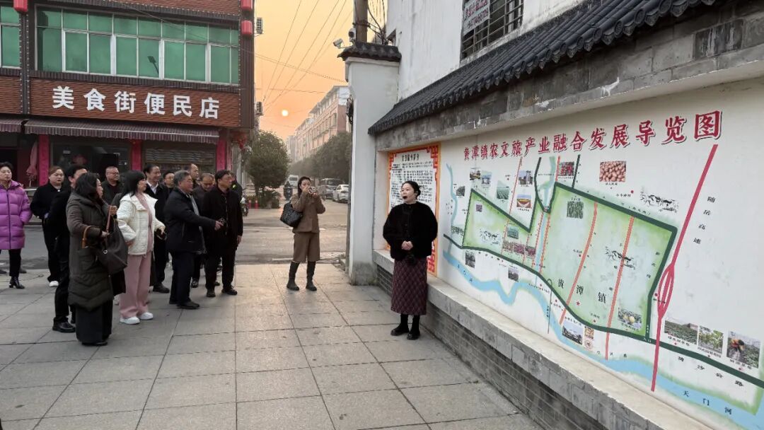 考察团首站驻足黄潭镇农旅文化导览图前,认真听取相关情况介绍,详细了解我镇以荷沙线、小北环、知青大道为主线精心打造的25公里“三横八纵”农文旅循环圈建设情况,以及“品黄潭米粉、拾竟陵文化、采四季瓜果、忆知青岁月”特色文化品牌的内涵与发展规划。