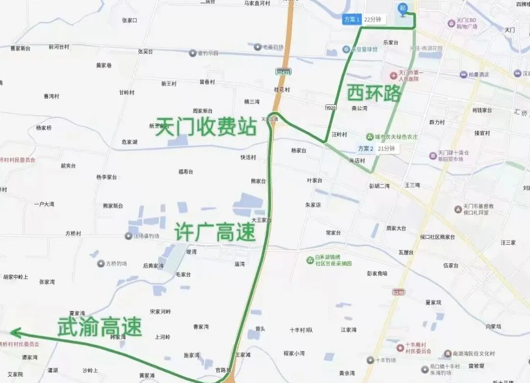 (推荐路线)路线一:由天门城区走西环路通过天门收费站上G0421许广高速,随后可转至G4223武渝高速,前往沙洋、多宝、拖市、蒋湖方向。